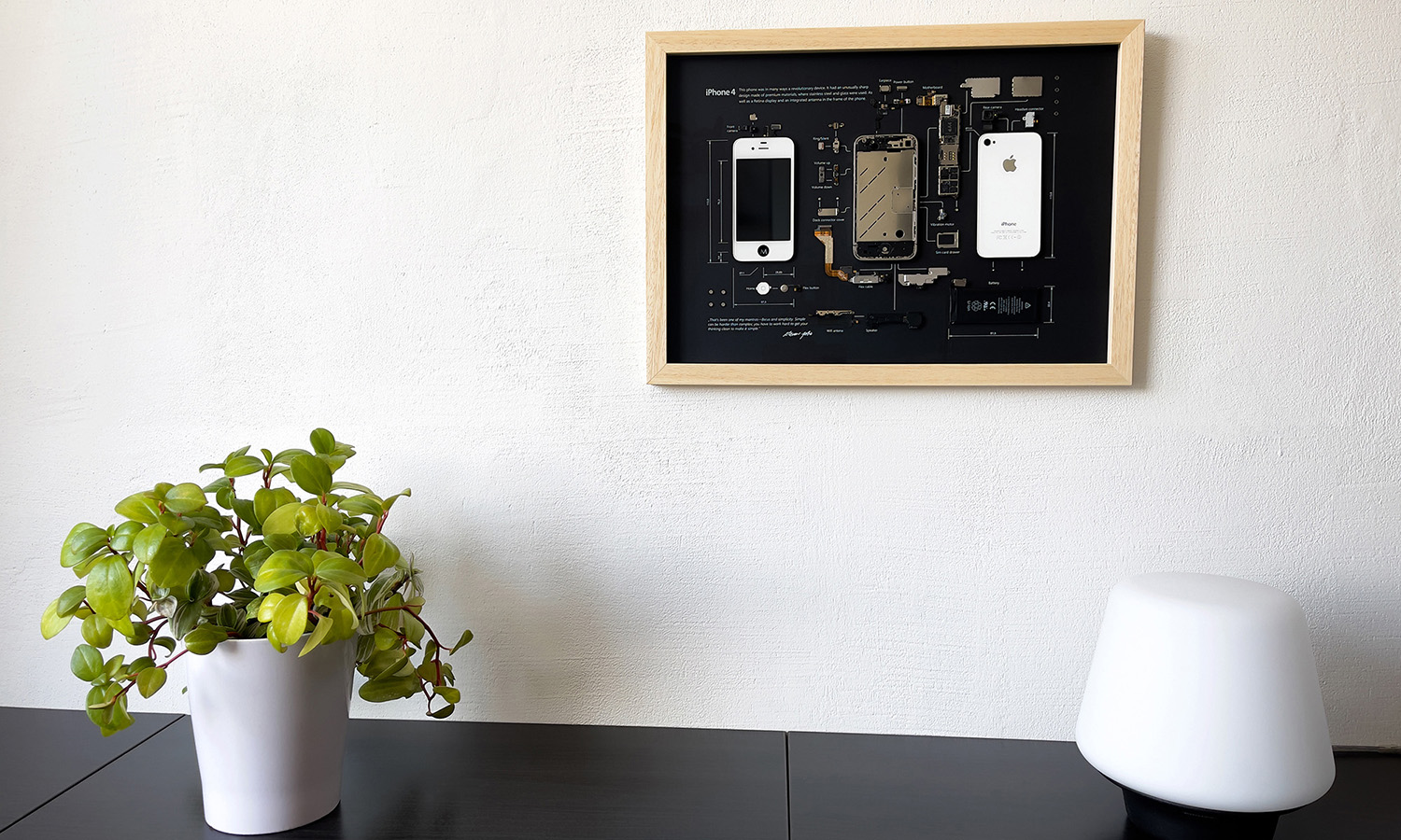 Vytváříme ručně vyráběné obrazy v Česku z použitých a nefunkčních iPhonů. Každý iPhone je pečlivě rozebrán, vyčištěn a přesně rozmístěn na požadovaná místa dle návrhu.Celý návrh je umístěn do dřevěného rámu a zakryt vysoce propustným sklem. Díky tomu je každý obraz jedinečný.